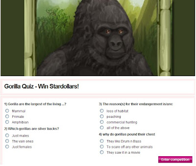 and get a chance to win Stardollars! The answers are 1-Primate, 2-Just males, 3-all of the above, 4-To scare off any other animals. Good luck!