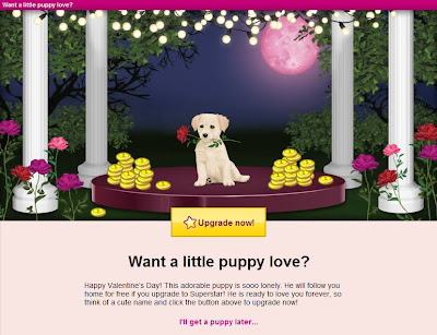 Stardoll wishes us a Happy Valentine's Day with a special Superstar Offer!! Upgrade to Superstar NOW and you'll get this super cute moving puppy!! Think of a cute name and click the "Upgrade now!" button!